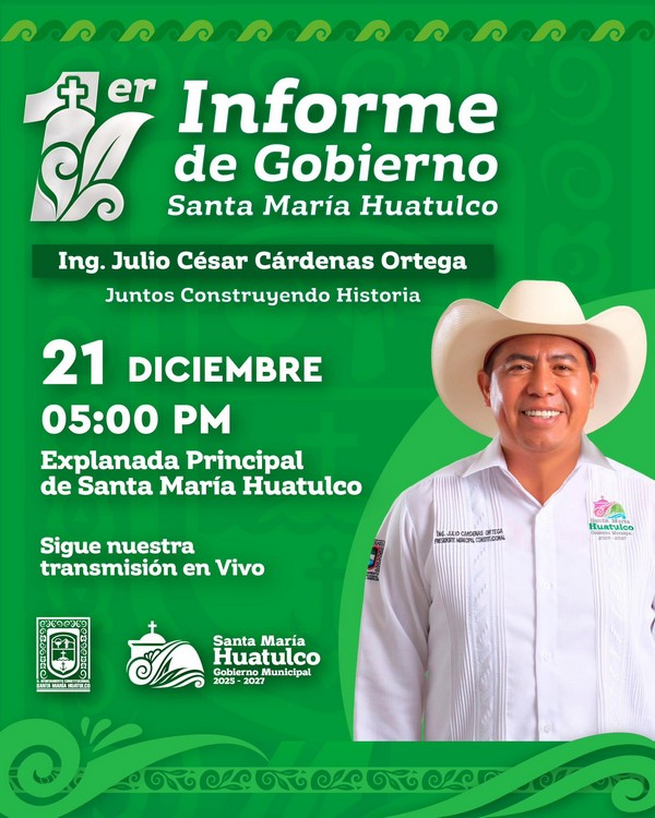 El Gobierno Municipal de Santa María Huatulco, que preside el Ing. Julio Cárdenas, invita a toda la ciudadanía a asistir al 1er Informe de Gobierno, un ejercicio de transparencia y compromiso con el municipio.