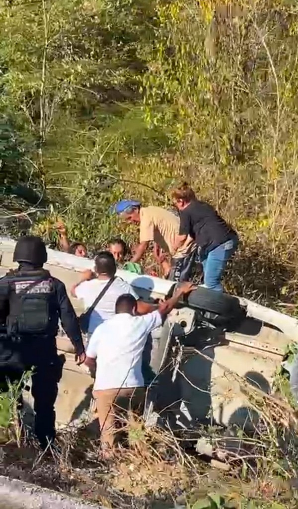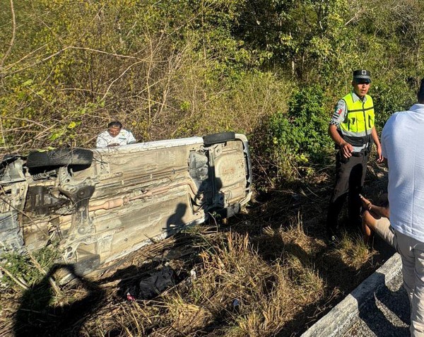 En el lugar, un vehículo tipo taxi sufrió una volcadura y se reportaron únicamente daños materiales. Personal de la Dirección de Salud realizó el traslado en ambulancia de dos personas, de iniciales S V T, de 73 años, y F M O, de 57 años, quienes presentaron crisis hipertensiva. Ambas personas fueron referidas al Hospital Comunitario de Santa María Huatulco para su valoración y la atención médica correspondiente.