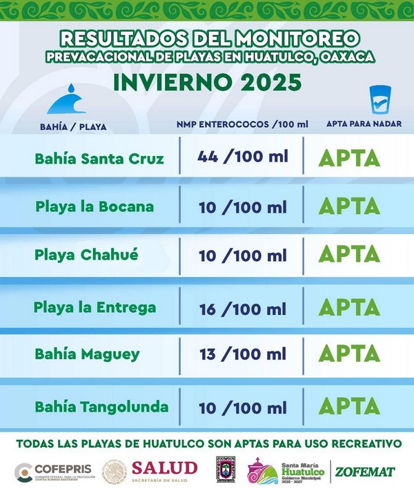 El Gobierno Municipal de Santa María Huatulco, que preside el Ing. Julio Cárdenas, a través de la Dirección de ZOFEMAT y en coordinación con COFEPRIS y la Secretaría de Salud, comparte con la ciudadanía los resultado del monitoreo prevacacional de playas en Huatulco, Oaxaca, correspondiente al invierno 2025.