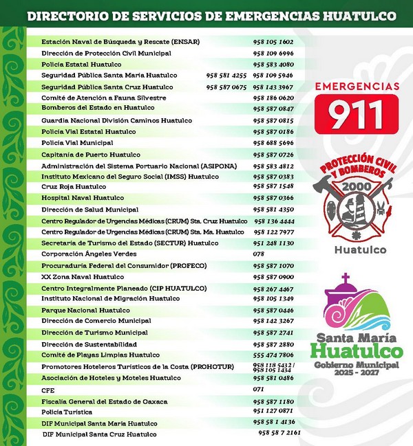 El Gobierno Municipal de Santa María Huatulco, que preside el Ing. Julio Cárdenas, comparte con toda la ciudadanía el Directorio de Corporaciones y Servicios de Emergencia de Huatulco, válido en todo el territorio de nuestro municipio.