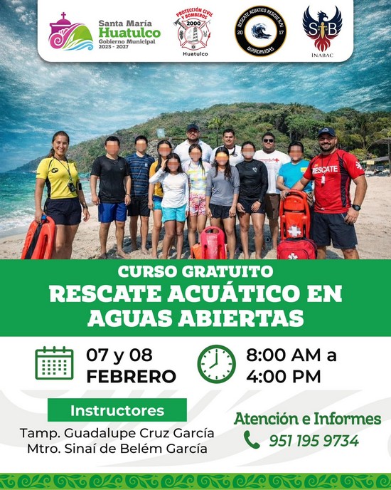 El Gobierno Municipal de Santa María Huatulco, que preside el Ing. Julio Cárdenas, a través de la Dirección de Protección Civil y Bomberos, invita a la ciudadanía a participar en el Curso Gratuito de Rescate Acuático en Aguas Abiertas, que se llevará a cabo los días 07 y 08 de febrero, en un horario de 8:00 hrs a 16:00 hrs.