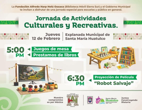 El Gobierno Municipal de Santa María Huatulco, que preside el Ing. Julio Cárdenas, en coordinación con la Fundación Alfredo Harp Helú Oaxaca a través de la Regiduría de Desarrollo Social, invita a la ciudadanía, escuelas y público en general a disfrutar de una Jornada de Actividades Culturales y Recreativas.