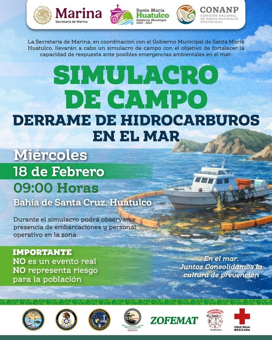 Con el objetivo de fortalecer la capacidad de respuesta ante posibles emergencias ambientales marítimas, el Gobierno Municipal de Santa María Huatulco, en coordinación con la Secretaría de Marina, la CONANP y diversas dependencias de los tres órdenes de gobierno, llevará a cabo un Simulacro de Campo a escala real por Derrame de Hidrocarburos en el Mar.