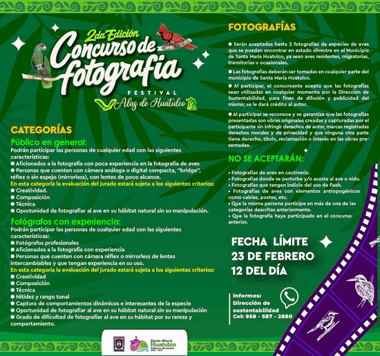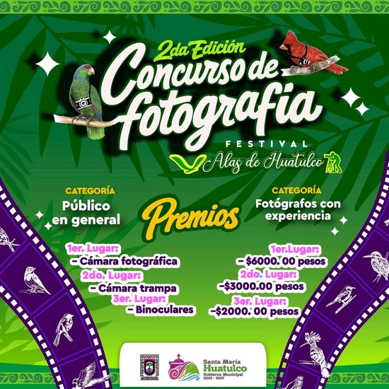 El Gobierno Municipal de Santa María Huatulco, que preside el Ing. Julio Cárdenas, a través de la Dirección de Sustentabilidad, invita a la ciudadanía a participar en el 2do Concurso de Fotografía del Festival de las Aves “Alas de Huatulco”, cuya fecha límite de recepción es el 23 de febrero.