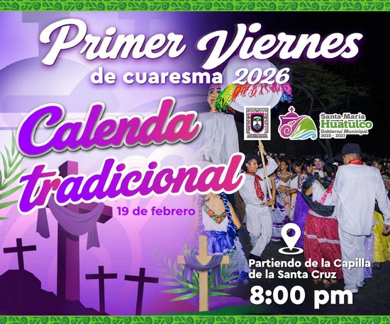 El Gobierno Municipal de Santa María Huatulco, que preside el Ing. Julio Cárdenas, invita a la ciudadanía a ser parte de la Calenda Tradicional con motivo del Primer Viernes de Cuaresma 2026, una celebración que fortalece nuestras raíces, fe y tradiciones.