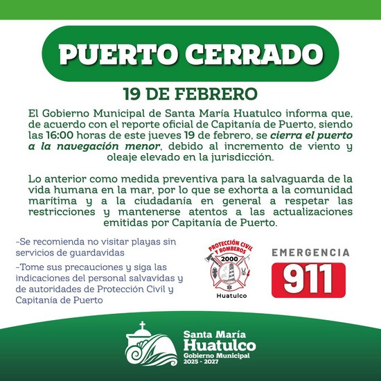 A partir de las 16:00 horas de este 19 de febrero, Capitanía de Puerto determinó el cierre del puerto debido a viento y oleaje elevado.