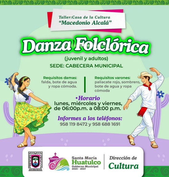 📅 Este lunes 23 de febrero inicia el taller de Danza Folclórica en la Casa de la Cultura “Macedonio Alcalá”. Te invitamos a integrarte a este espacio dirigido a jóvenes y personas adultas, enfocado en preservar y fortalecer nuestras tradiciones e identidad cultural.