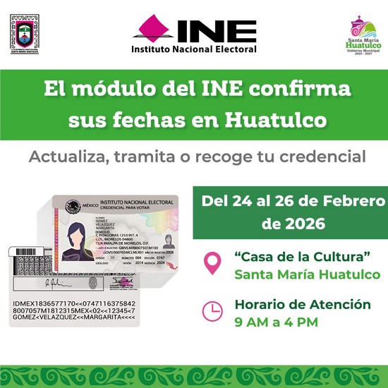 El Instituto Nacional Electoral informa a la ciudadanía que el módulo de atención estará en Santa María Huatulco para que puedas actualizar, tramitar o recoger tu credencial para votar.