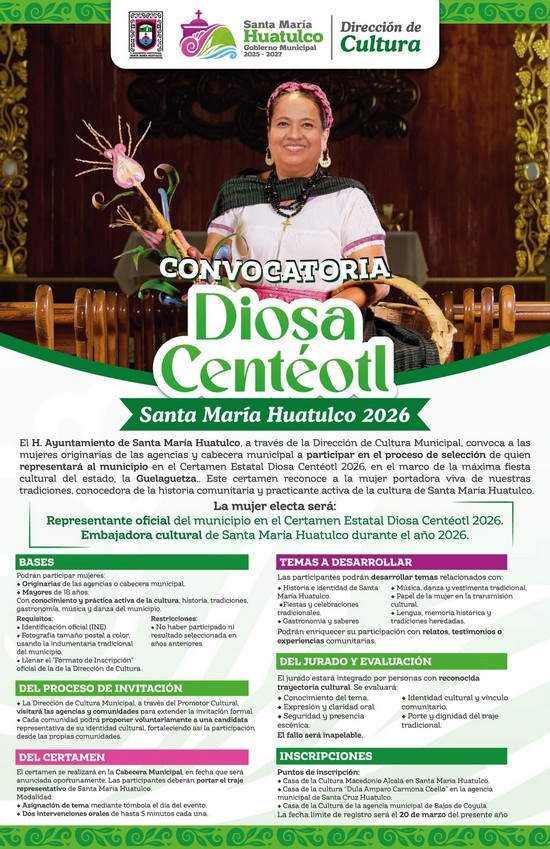 El Gobierno Municipal que preside el Ing. Julio Cárdenas, a través de la Dirección de Cultura Municipal, invita a las mujeres originarias de las agencias y cabecera municipal a participar en el proceso de selección de quien representará a nuestro municipio en el Certamen Estatal Diosa Centéotl 2026, en el marco de la máxima fiesta cultural de Oaxaca, la Guelaguetza.