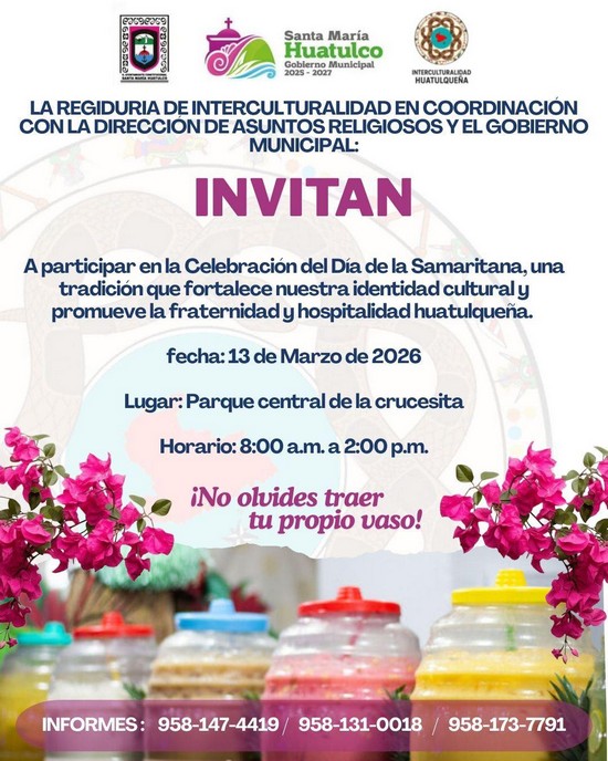 El Gobierno Municipal de Santa María Huatulco, que preside el Ing. Julio Cárdenas, a través de la Regiduría de Interculturalidad en coordinación con la Dirección de Asuntos Religiosos, invita a la ciudadanía y a los visitantes que se encuentran en Bahías de Huatulco a participar en la celebración del Día de la Samaritana, una tradición que fortalece nuestra identidad cultural y promueve la fraternidad y hospitalidad huatulqueña.