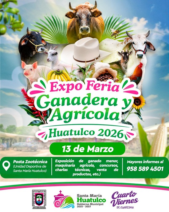 El Gobierno Municipal de Santa María Huatulco, que preside el Ing. Julio Cárdenas, invita a la ciudadanía a disfrutar de la Expo Feria Ganadera y Agrícola Huatulco 2026, que se llevará a cabo el próximo 13 de marzo en la Posta Zootécnica (Unidad Deportiva de Santa María Huatulco), en el marco de las actividades del Cuarto Viernes de Cuaresma.