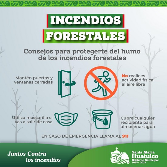 Ante la presencia de incendios forestales, el Gobierno Municipal de Santa María Huatulco exhorta a la población a tomar medidas preventivas para proteger su salud ante el humo. Mantén puertas y ventanas cerradas, evita realizar actividad física al aire libre, utiliza mascarilla si necesitas salir de casa y mantén cubiertos los recipientes donde almacenes agua. En caso de emergencia, llama al 911.