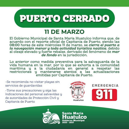 La Capitanía de Puerto de Bahías de Huatulco informa que, a partir de las 08:00 horas de este miércoles 11 de marzo, se determinó el cierre del puerto a embarcaciones menores y a toda actividad turística náutica, debido a oleaje elevado y fuerte rebase ocasionado por el fenómeno de mar de fondo.