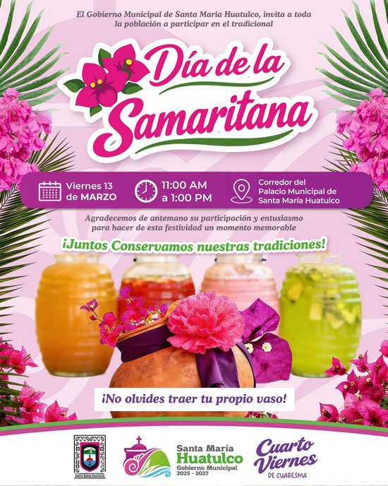 El Gobierno Municipal de Santa María Huatulco, que preside el Ing. Julio Cárdenas, invita cordialmente a la ciudadanía a participar en el tradicional Día de la Samaritana, una celebración que forma parte de nuestras costumbres y fortalece la convivencia comunitaria.