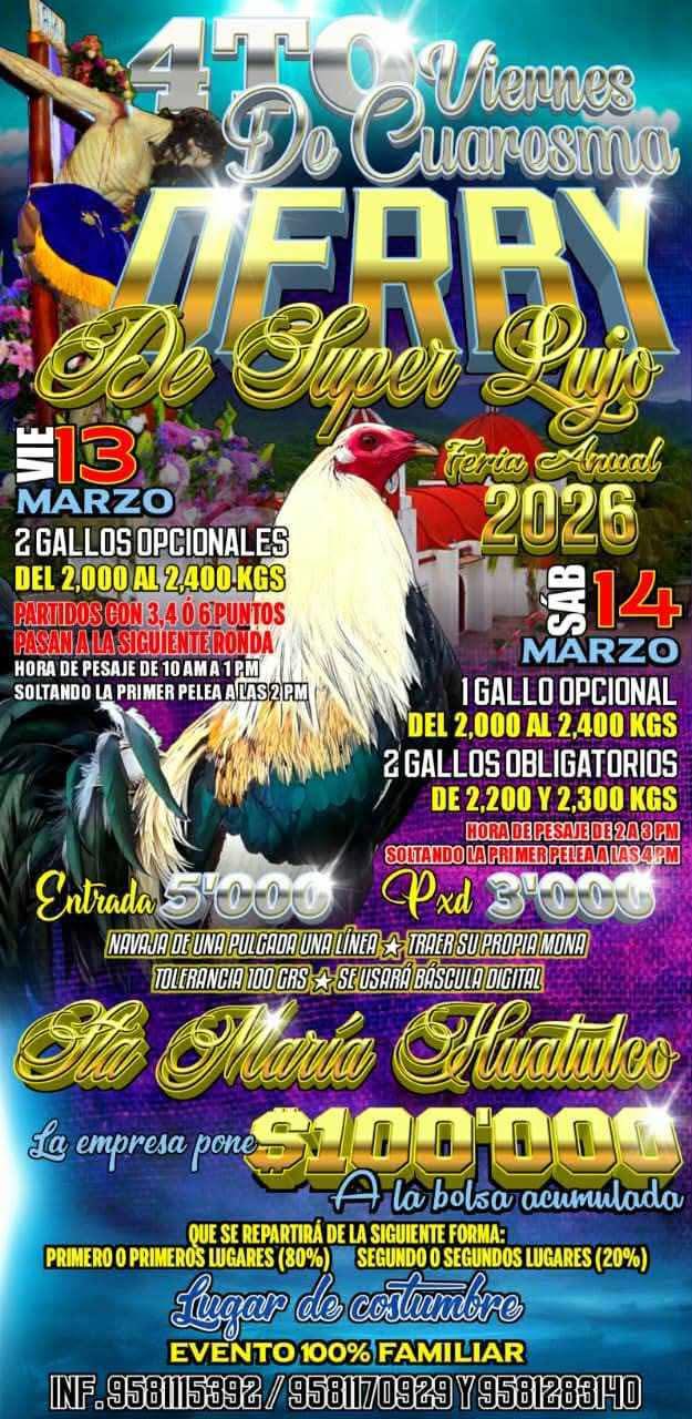 En el marco de las celebraciones del Cuarto Viernes de Cuaresma, el Gobierno Municipal, invita a la ciudadanía a disfrutar del Derby de Súper Lujo, que se llevará a cabo los días viernes 13 y sábado 14 de marzo en Santa María Huatulco.