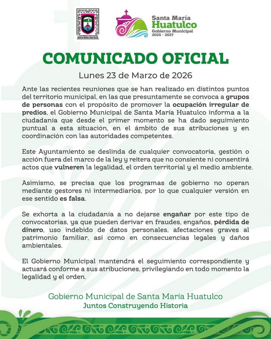 Comunicado oficial del Gobierno Municipal de Santa María Huatulco.