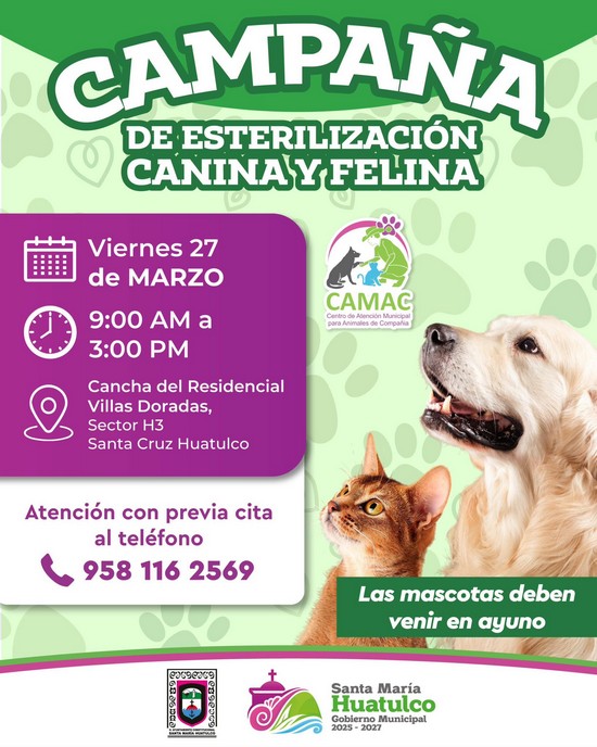 El Gobierno Municipal de Santa María Huatulco, que preside el Ing. Julio Cárdenas, invita a la ciudadanía a participar en la Campaña de Esterilización Canina y Felina, a través del Centro de Atención Municipal para Animales de Compañía (CAMAC), con el objetivo de fomentar el bienestar animal y la tenencia responsable.
