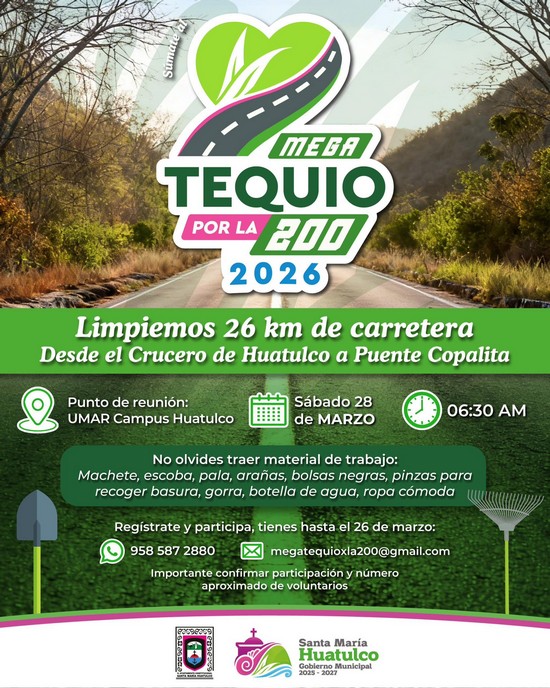 Con el objetivo de fortalecer el cuidado del entorno y promover la participación ciudadana, se invita a la población a formar parte del Mega Tequio por la 200, una jornada de limpieza que busca mantener en óptimas condiciones la Carretera Federal 200 y seguir construyendo un Huatulco más limpio.