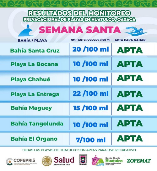 El Gobierno Municipal de Santa María Huatulco, que preside el Ing. Julio Cárdenas, a través de la Dirección de ZOFEMAT en coordinación con COFEPRIS y la Secretaría de Salud, comparte con la ciudadanía, los resultados del monitoreo prevacacional de playas 2026.