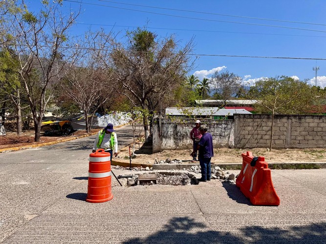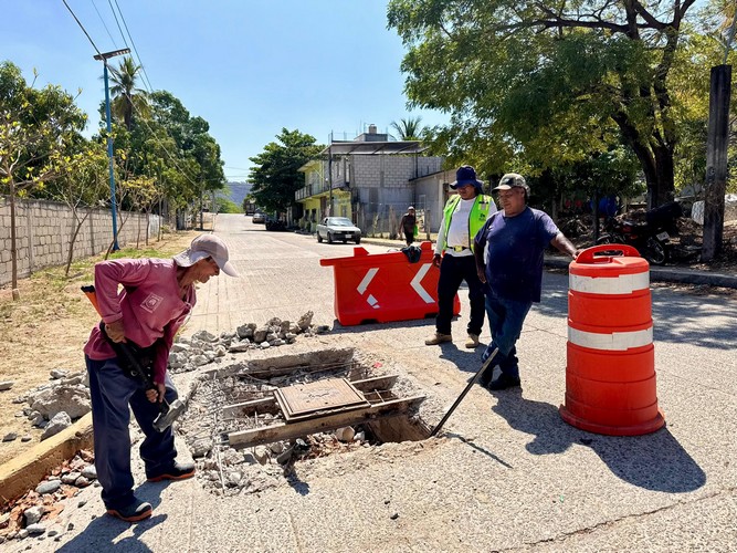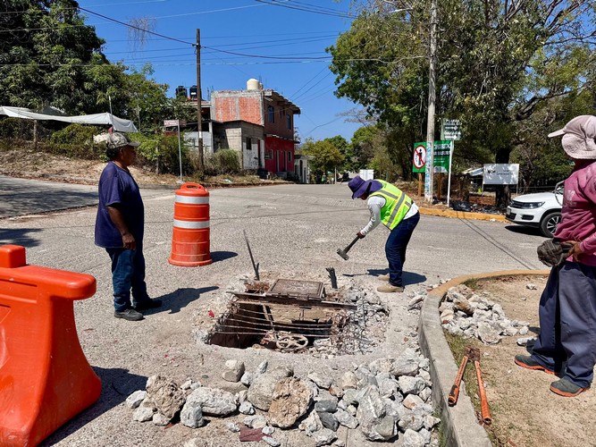 El Gobierno Municipal de Santa María Huatulco, que preside el Ing. Julio Cárdenas, a través de la Dirección de Servicios Públicos Municipales, realiza trabajos de mantenimiento en la vía pública, llevando a cabo la reposición de la tapa de registro en la intersección de las calles Galeana y La Gradera.