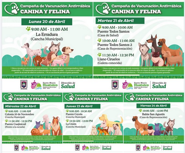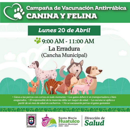 El Gobierno Municipal de Santa María Huatulco, que preside el Ing. Julio Cárdenas, a través de la Dirección de Salud, invita a la ciudadanía a participar en la Campaña de Vacunación Antirrábica Canina y Felina, con el objetivo de proteger la salud de las mascotas y prevenir riesgos en la población.
