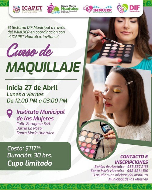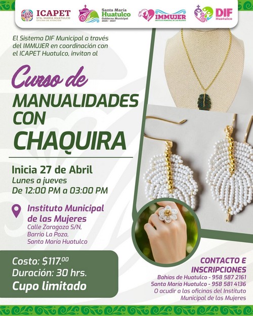 El Gobierno Municipal de Santa María Huatulco, que preside el Ing. Julio Cárdenas, a través del Sistema DIF Municipal y el Instituto Municipal de las Mujeres (IMMUJER), en coordinación con ICAPET Huatulco, te invita a inscribirte en los cursos de Manualidades con Chaquira y Maquillaje.