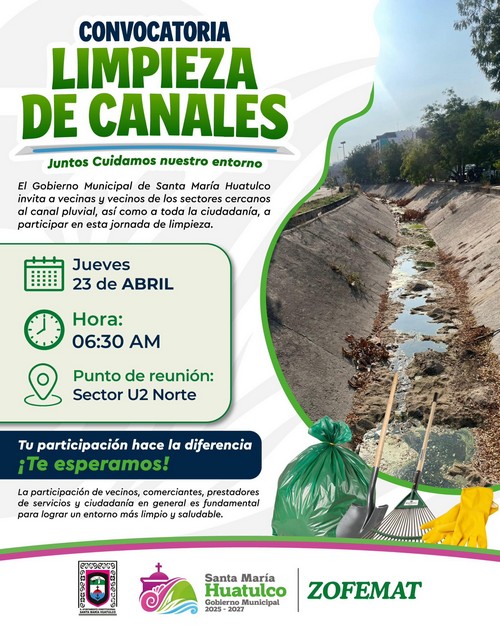 El Gobierno Municipal de Santa María Huatulco, que preside el Ing. Julio Cárdenas, a través de ZOFEMAT, invita a la ciudadanía a participar en la jornada de limpieza del canal pluvial, una acción clave para reducir riesgos sanitarios y mejorar nuestro entorno.