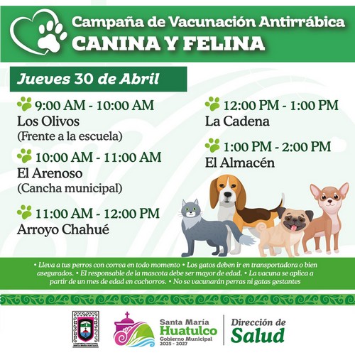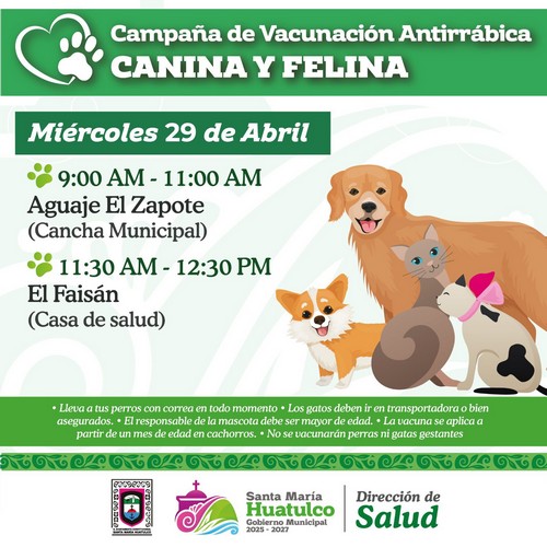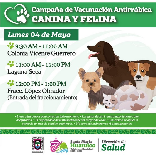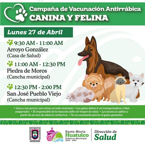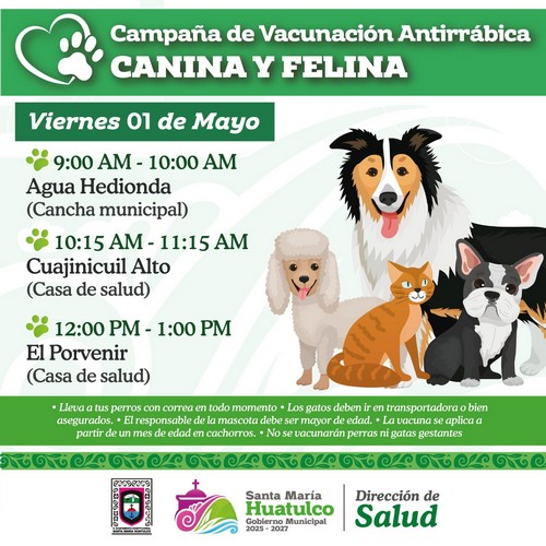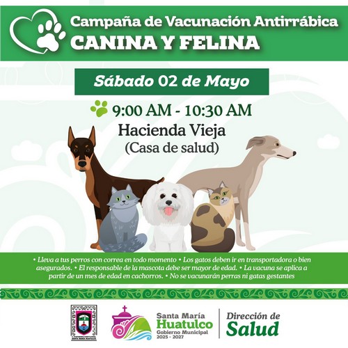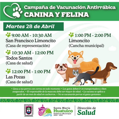 El Gobierno Municipal de Santa María Huatulco, encabezado por el Ing. Julio Cárdenas, a través de la Dirección de Salud, informa que continúan las jornadas de vacunación antirrábica para perros y gatos en distintas comunidades del municipio.