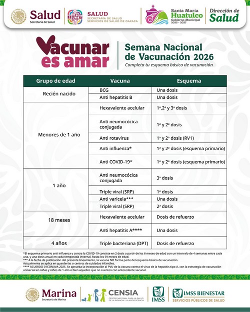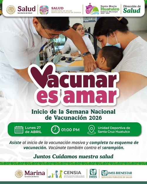 El Gobierno Municipal de Santa María Huatulco, que preside el Ing. Julio Cárdenas, a través de la Dirección de Salud y en coordinación con la Secretaría de Salud, invita a la población a participar en el inicio de la Semana Nacional de Vacunación 2026, con el objetivo de proteger la salud de niñas, niños y población en general.